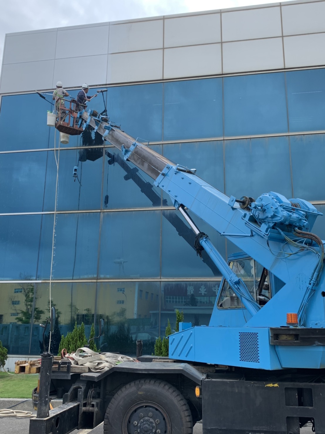 (1) 操作人員坐于吊板規(guī)定位置,將所有用具扎連在吊板上口側(cè)身下;(2) 緩緩將吊板下放,到達(dá)第一工作位置;(3) 用水槍(或噴壺)對準(zhǔn)工作位置放水,初步除去塵灰,然后將清潔劑涂在玻璃或墻角上,稍后用刮條、或刷水擦拭,最后用抹布將墻面揩干。(4) 一個位置工作結(jié)束,緩緩調(diào)整至下一個位置繼續(xù)清潔直該縱向位置至工作結(jié)束,然后再橫向移動位置;(5) 整個工作過程中,安全監(jiān)督應(yīng)自始至終作現(xiàn)場安全監(jiān)督,不得擅離職守; (6) 清洗玻璃幕墻嚴(yán)禁使用堿性清潔劑,否則會造成幕墻鍍膜在半月左右斑脫、褪色等嚴(yán)重后果。